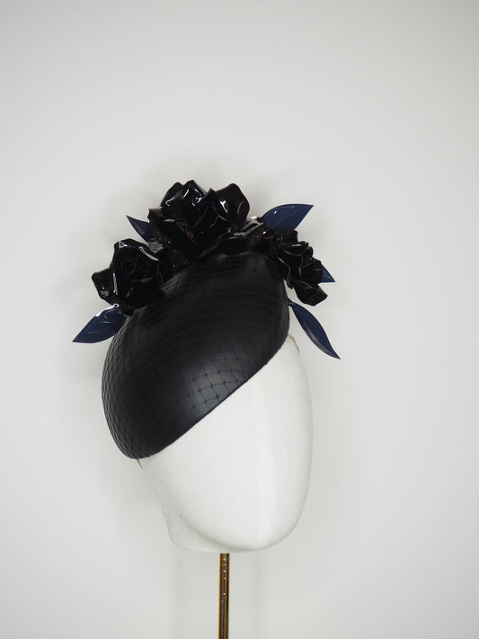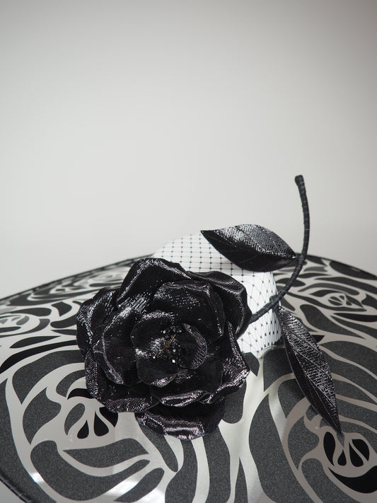 De Ville Rose - Sweeping crystoform wired brim with black rose petal pattern and single shiny dramatic rose with white leather veiled crown