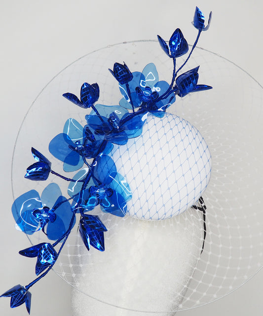 Dancing Orchids - Blue crystoform orchids on a white leather veiles percher base with veil detail