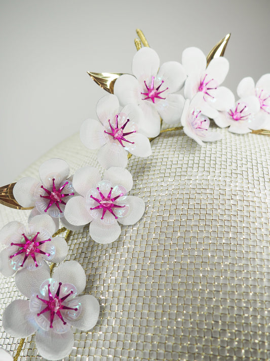 Cherry blossom - Pale gold and white Coolie Brim with cherry blossom branch and a touch of pink