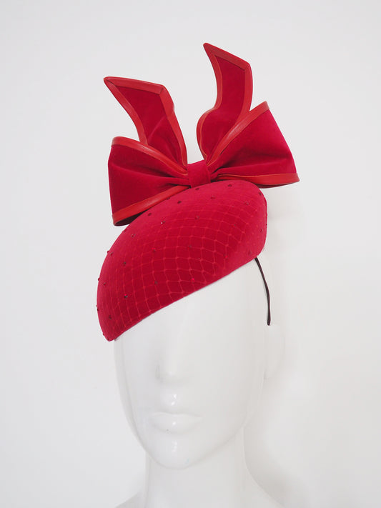 The Gift - Red wired upside down velvet bow with leather and crystal details.