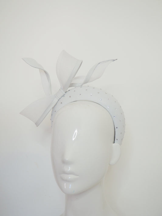 Little Bow Peep -White Leather 3d headband with leather edged bow and crystal detail