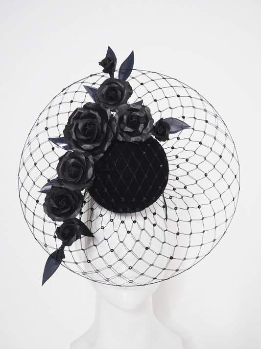 Velvet night - Black velvet veiled percher with leather flowers and crystal detail
