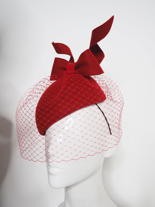 Red velvet - Deep red fur felt large beret with windswept bow, veil and patent leather centre