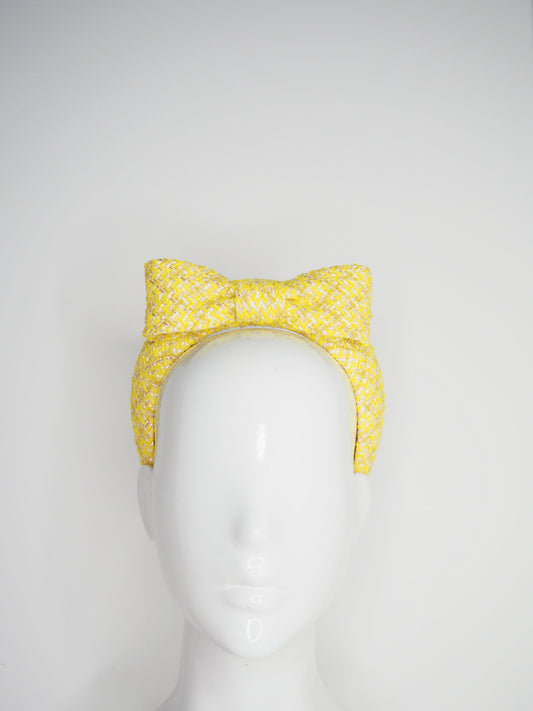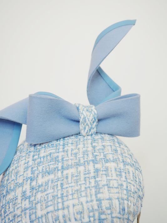 Blue swirl and whirl - Powder blue leather edged wired felt bow on a tweed petite facehugger