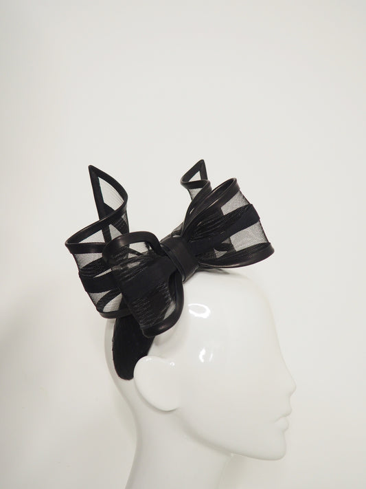 Windswept Bow - Black leather 3d headband with windswept crinoline wired bow.