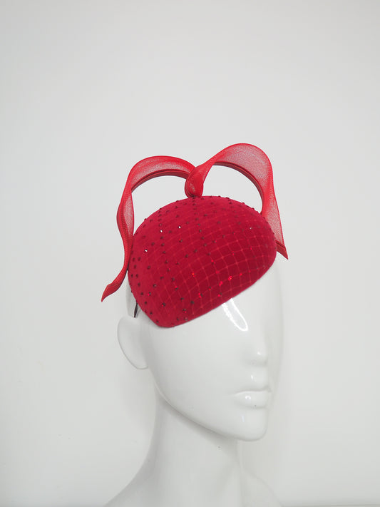 Petite Heart - Petite red velvet face hugger with cross hatch diamanté and veil detail an heart crin swirl