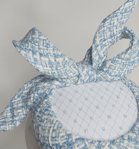 Blue Belle - Blue tweed button base with wired tweed bow and crystal veil