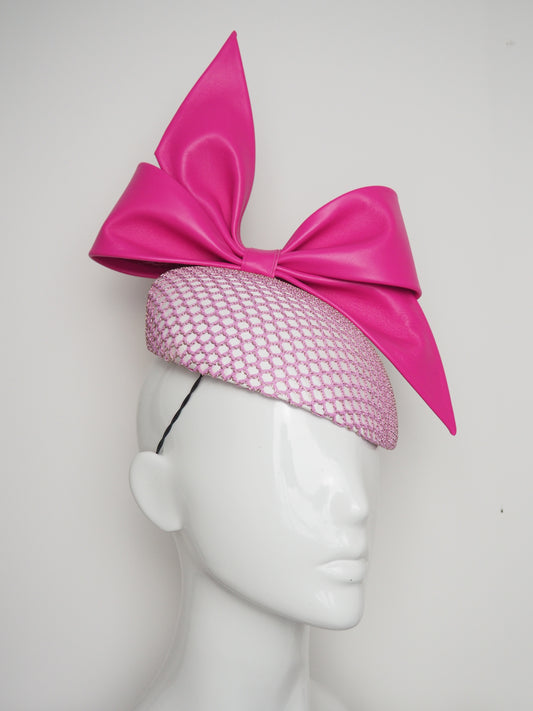 Bowie - Hot Pink Leather bow with hand dyed mesh with gold lurex beret base