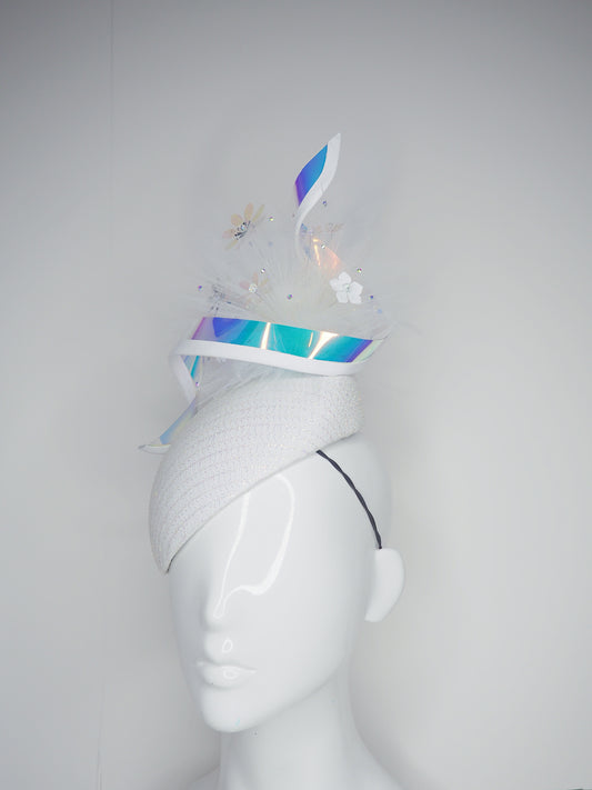 *worn once reduced - Unicorn Dreams - White leather Beret base with iridescent mesh, leather edged swirl and a embellished tulle pom pom