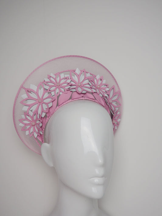 Hello halo - White and pink leather cutout flowers with wired crinoline halo and white details