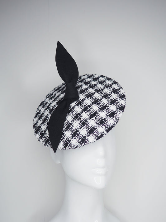 Check Chic - Black and white tweed percher disc with simple, elegant fur felt knot