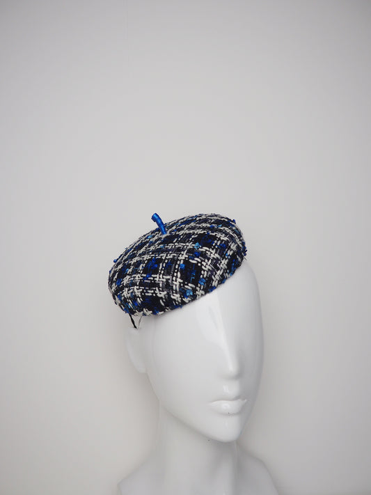 Polly - Large blue, black and white tweed button base with blue leather detail
