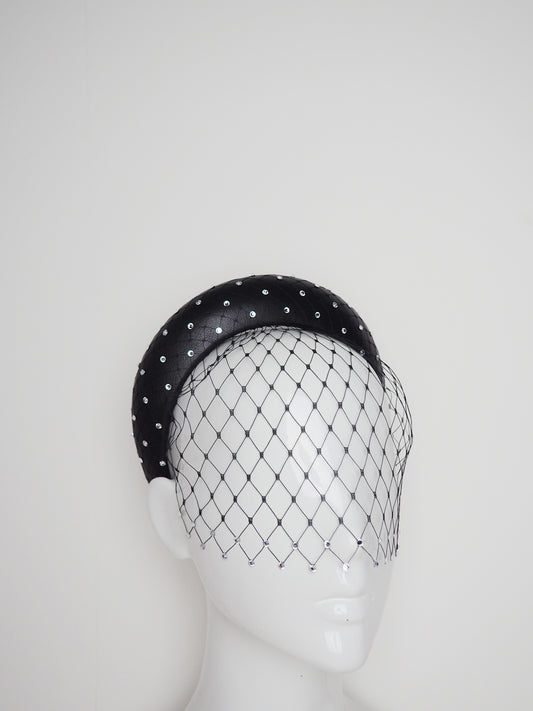 Mia - Sparkle - Black leather 3d Blocked headband with veil and crystals with removable veil headband