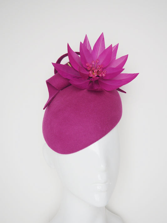 Magenta Magic - Magenta wool felt beret with swirl detail and wired feather flower