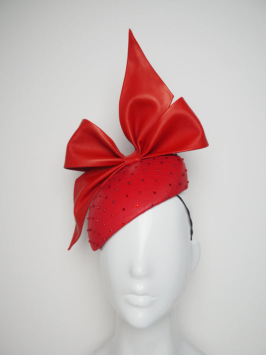 Sparkle Bowie - Shades of red leather on a diamanté veil face hugger beret base