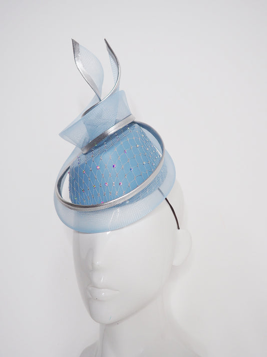 Frozen in time - Blue asymetrical leather base with silver veil and iridescent crystals and a crinoline swirl