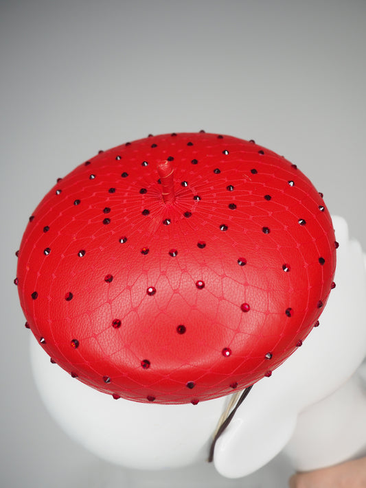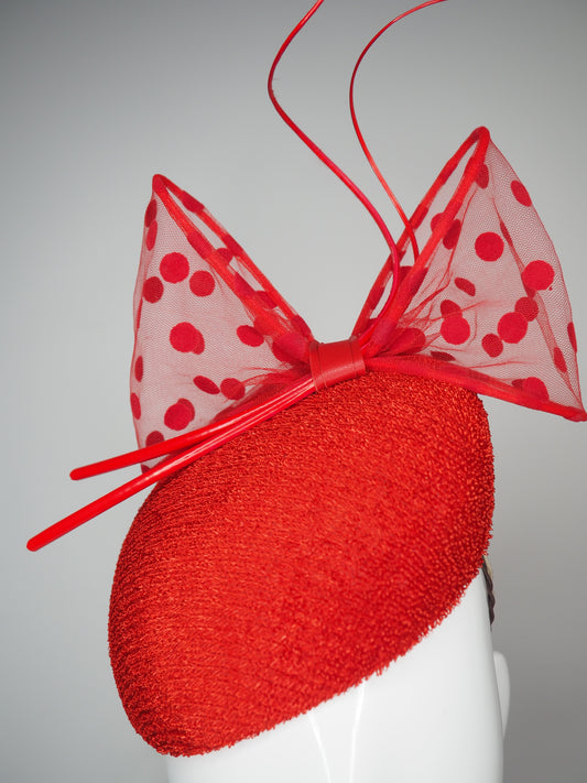 Stop and Spot - Spotty red wired tulle bow with quills on a vintage straw face hugger beret