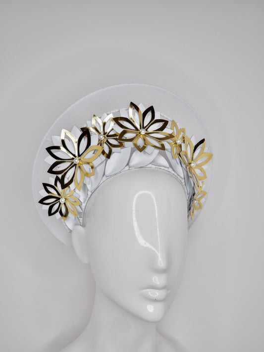 Hello Halo - Gold gloss leather cutout flowers with wired crinoline halo and white details