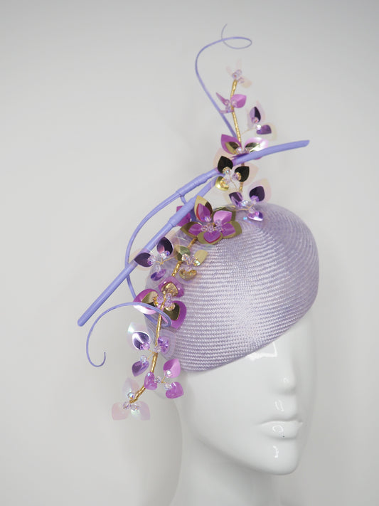 Purple Sky - Lilac facehugger base with sequinned blossoms and quills.