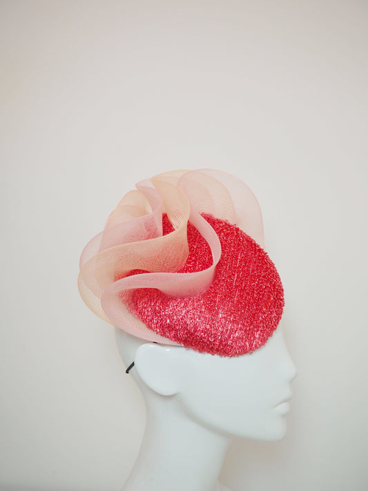 Pink Coral - Vintage raffia watermelon pink straw with pink and peach ruffle crinoline detail on a face hugger base.