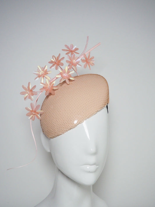 Peachy Pink - Iridescent pastel pink blossoms and quill on a peach blossom sequin facehugger base.