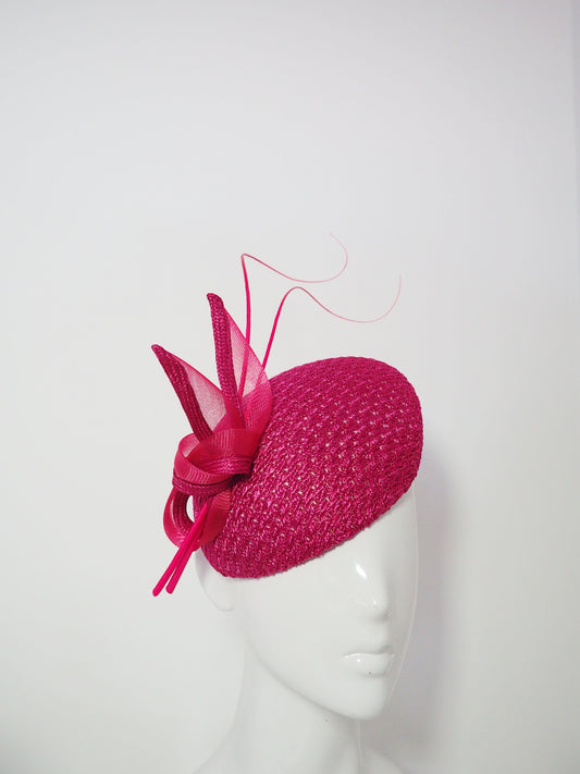 Raspberry Beret - Raspberry pink vintage straw cloth with crinoline and straw knot and quills.