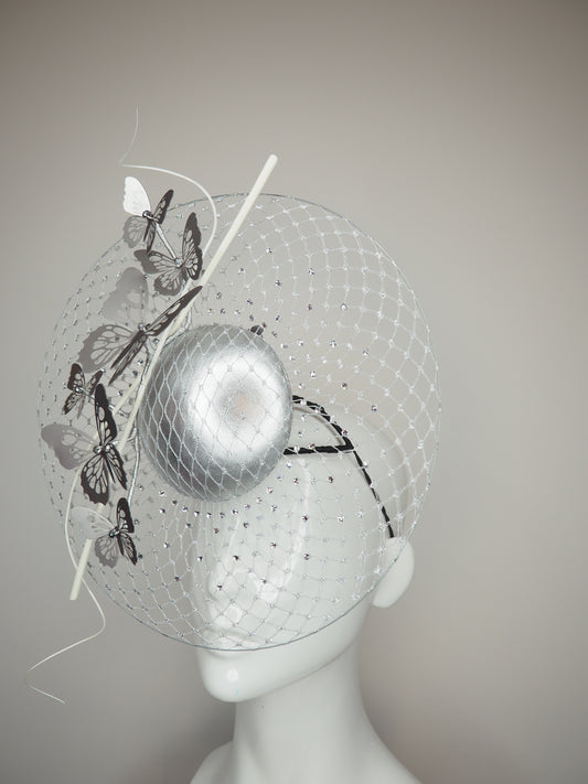 Taking Flight - Silver leather veiled percher with crystoform butterflies