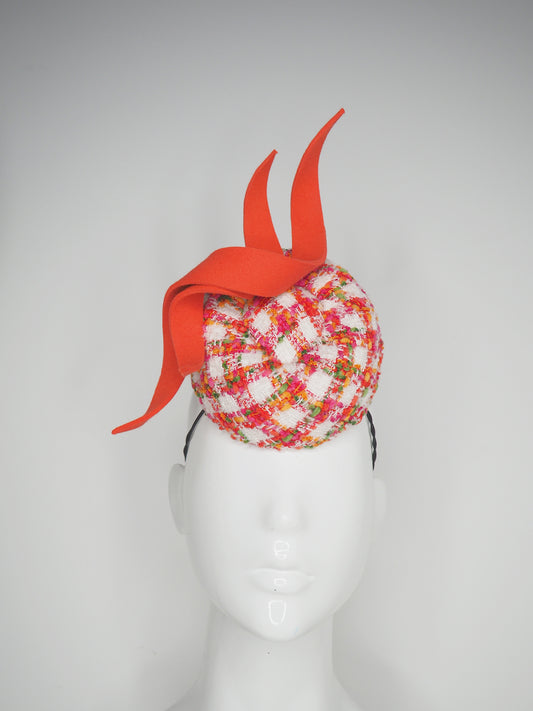 Coral pop - Multicolour tweed pork pie pillbox with coral fur felt swirls.