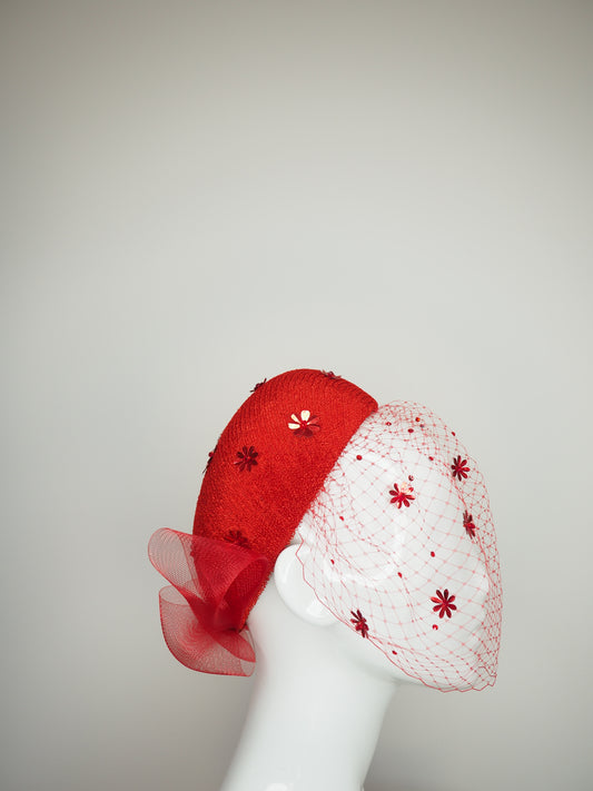 Blushing Bride - Red vintage straw pillbox with beaded sequin flower detail and crystal veil