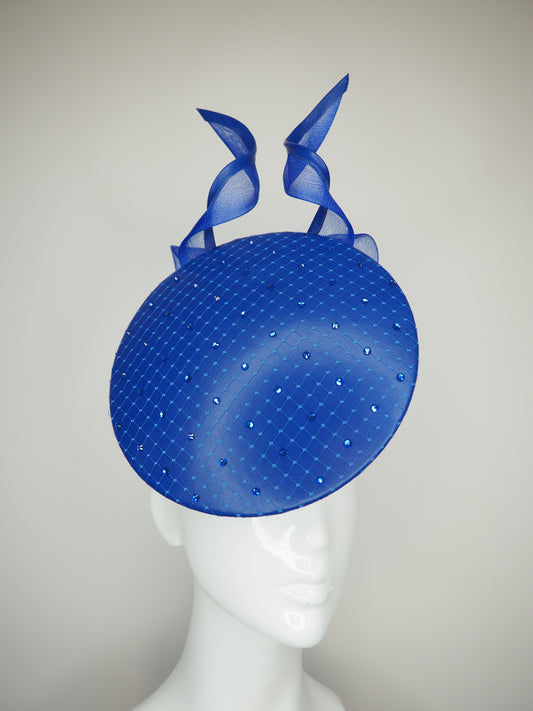 Sapphire Shimmer - Blue floating disc with leather bound crinoline bow and crystal embellsihed veil