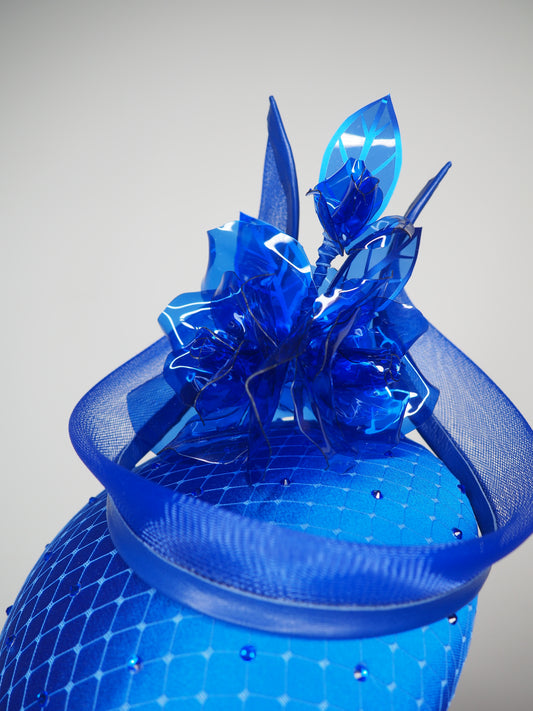 Frozen in time - Blue asymetrical leather base with silver veil and iridescent crystals and a crinoline swirl
