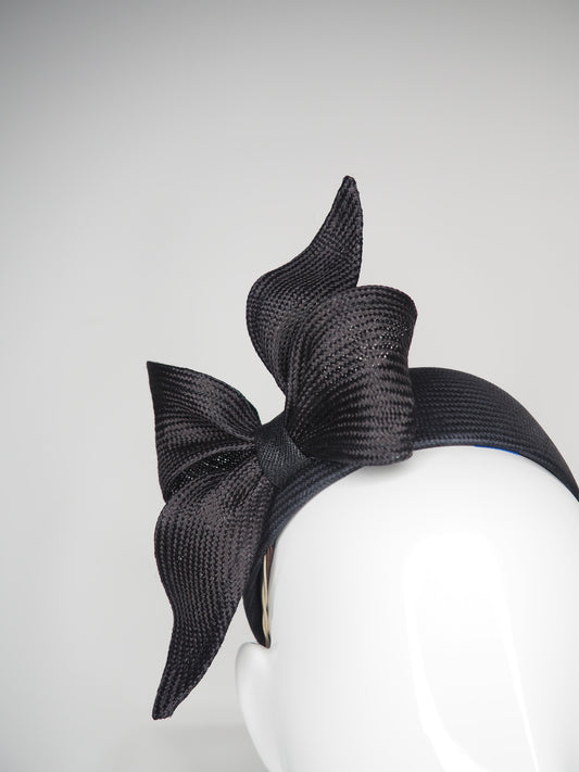 Little Black Hat -Black Rear Facing Pillbox with petite wired bow
