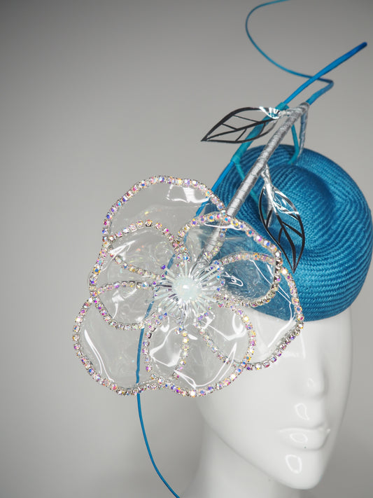 Turqoise Twinkle - Turquoise parisissal pork pie pillbox with iridescent crystoform flower and quill detail.
