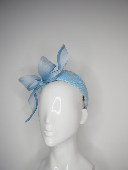 Sky High - Baby Blue Jacki-O style rear facing pillbox featuring a leather edged crinoline bow in baby blue.