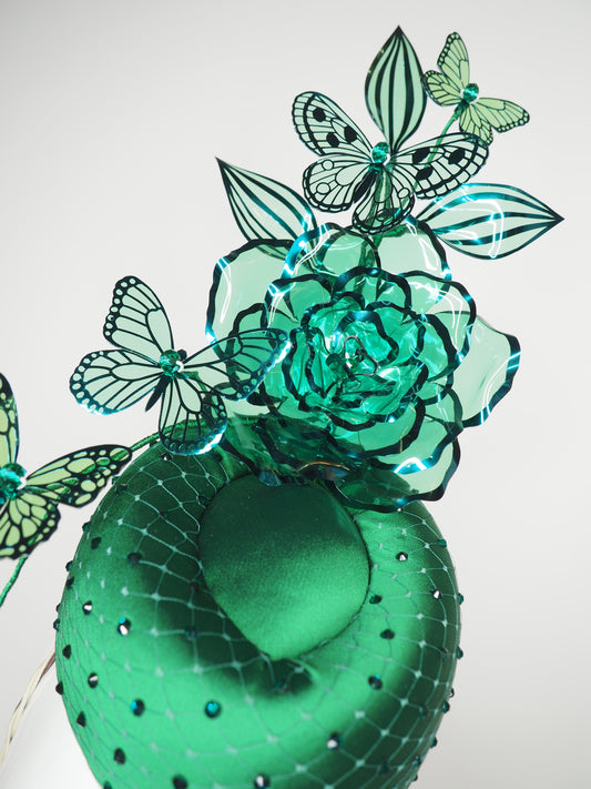 Butterfly Effect - Emerald Green satin embellished pork pie percher with butterflies and rose.
