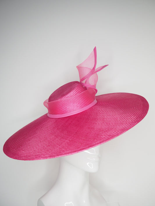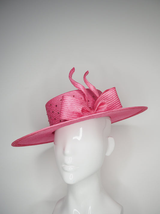 Pink Lady - Pink broad brimmed slanted crown parissisal with crinoline leather edged swirl detail