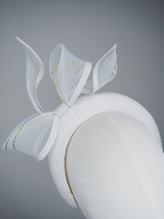 Little Bow Peep -White cotton and raffia 3d headband with leather gold lurex edged bow