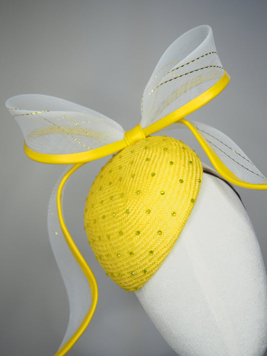 Sunshine - Yellow Petite Facehugger – yellow straw base covered in crystals, with white and gold crinoline bow edged in yellow leather
