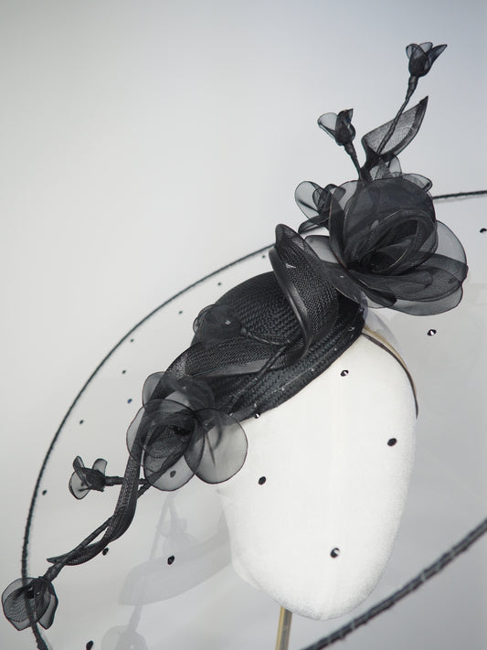 A Rainy Day in Melbourne - Black clear cristoform brim with wispy crinline roses & crinoline swirl