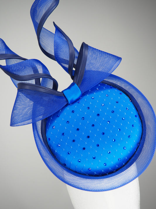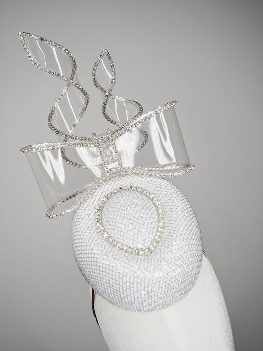 Bow & Grace - white and silver lurex Pork pie pillbox with embellihed crystoform bow