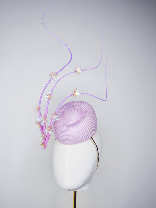 Blossoms in Flight - Pastel lilac pork pie pillbox with floating quills and iridescent cherry blossom detail