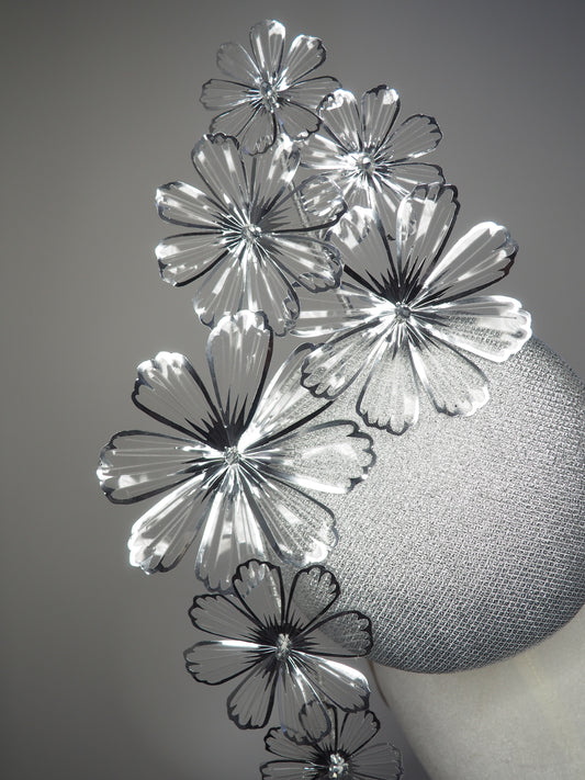 celestial Cosmos - Silver round percher with crystoform silver and clear Cosmo flowers