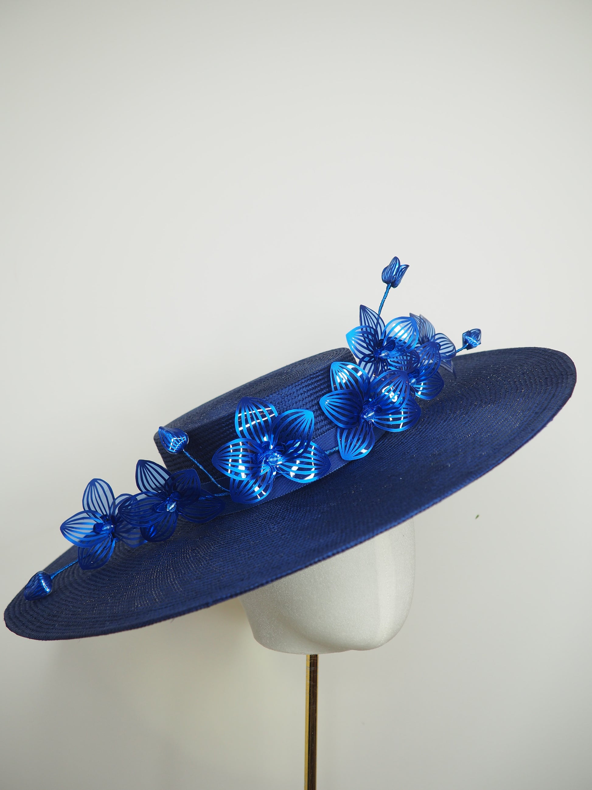 A statement boater in deep royal blue, adorned with a winding orchid Crystoform vine in tonal shades of blue. Elegant yet fresh, this piece makes an elevated choice for racewear or a refined garden party.
