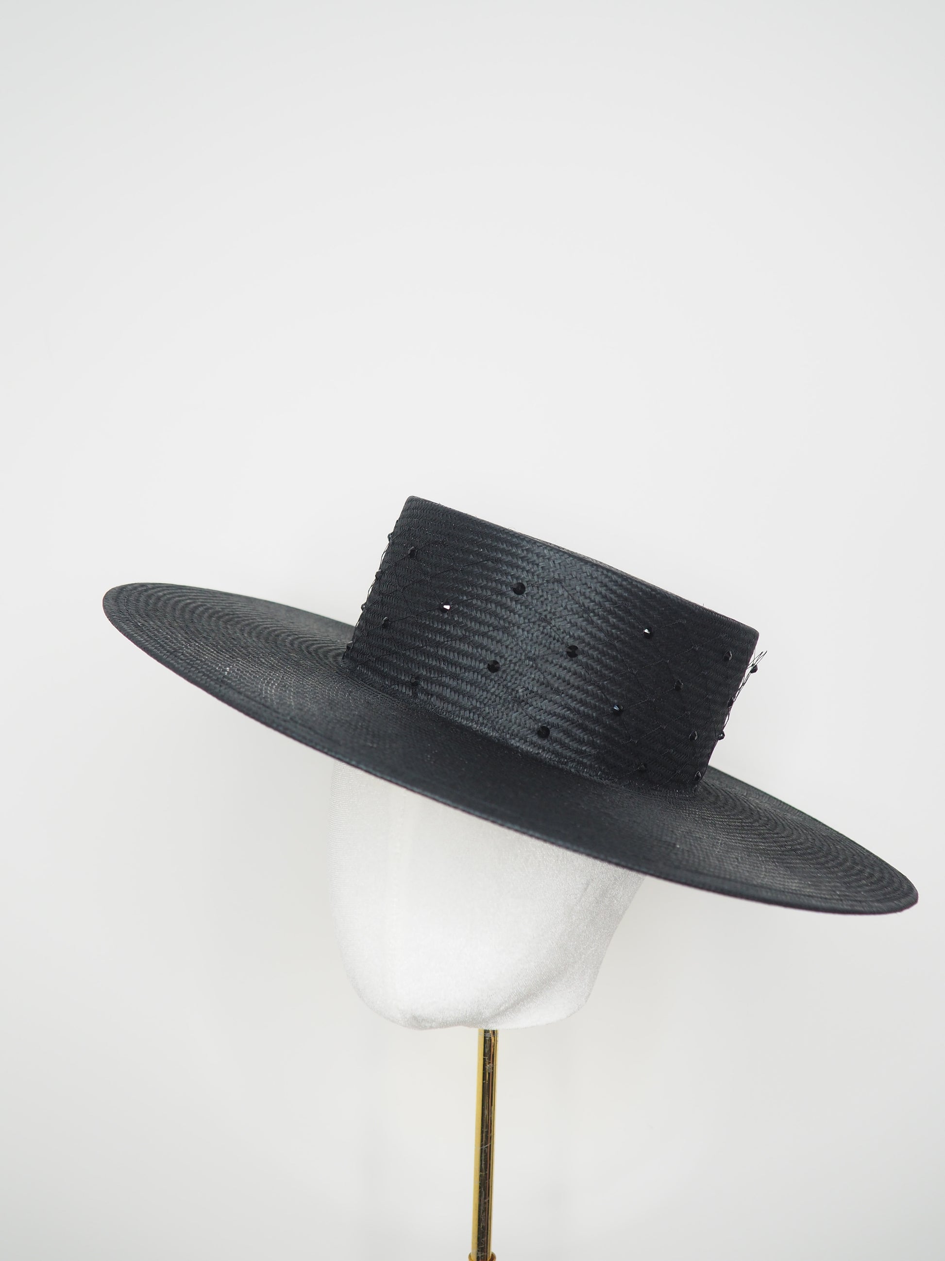 Black Stardust - Classic Black straw boater with crystal and veil detail