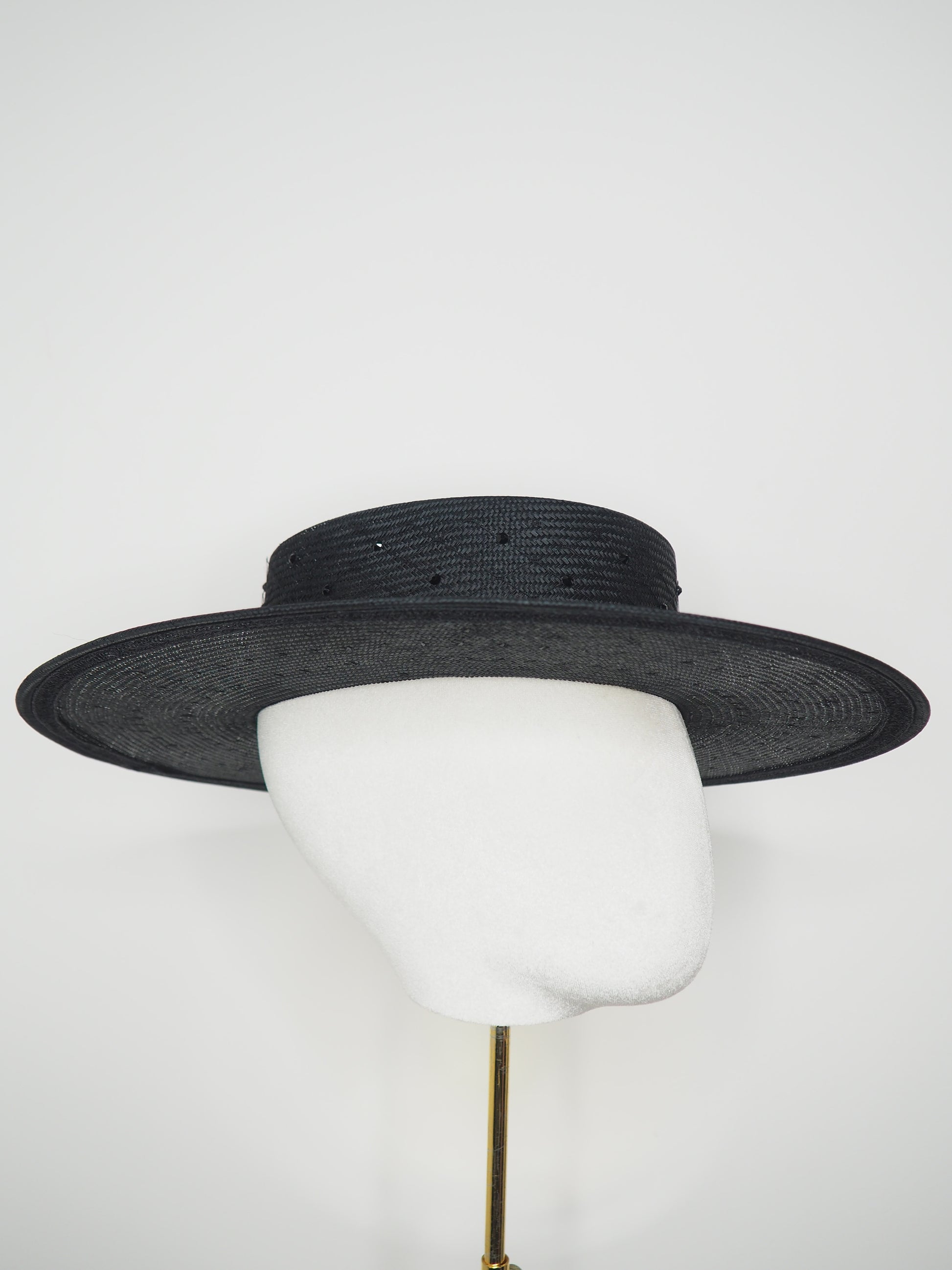 A timeless black boater elevated with a beautifully embellished veil for soft movement and modern sophistication. Chic, structured, and endlessly wearable, this piece is ideal for Derby Day, classic monochrome outfits, and elegant race meetings.