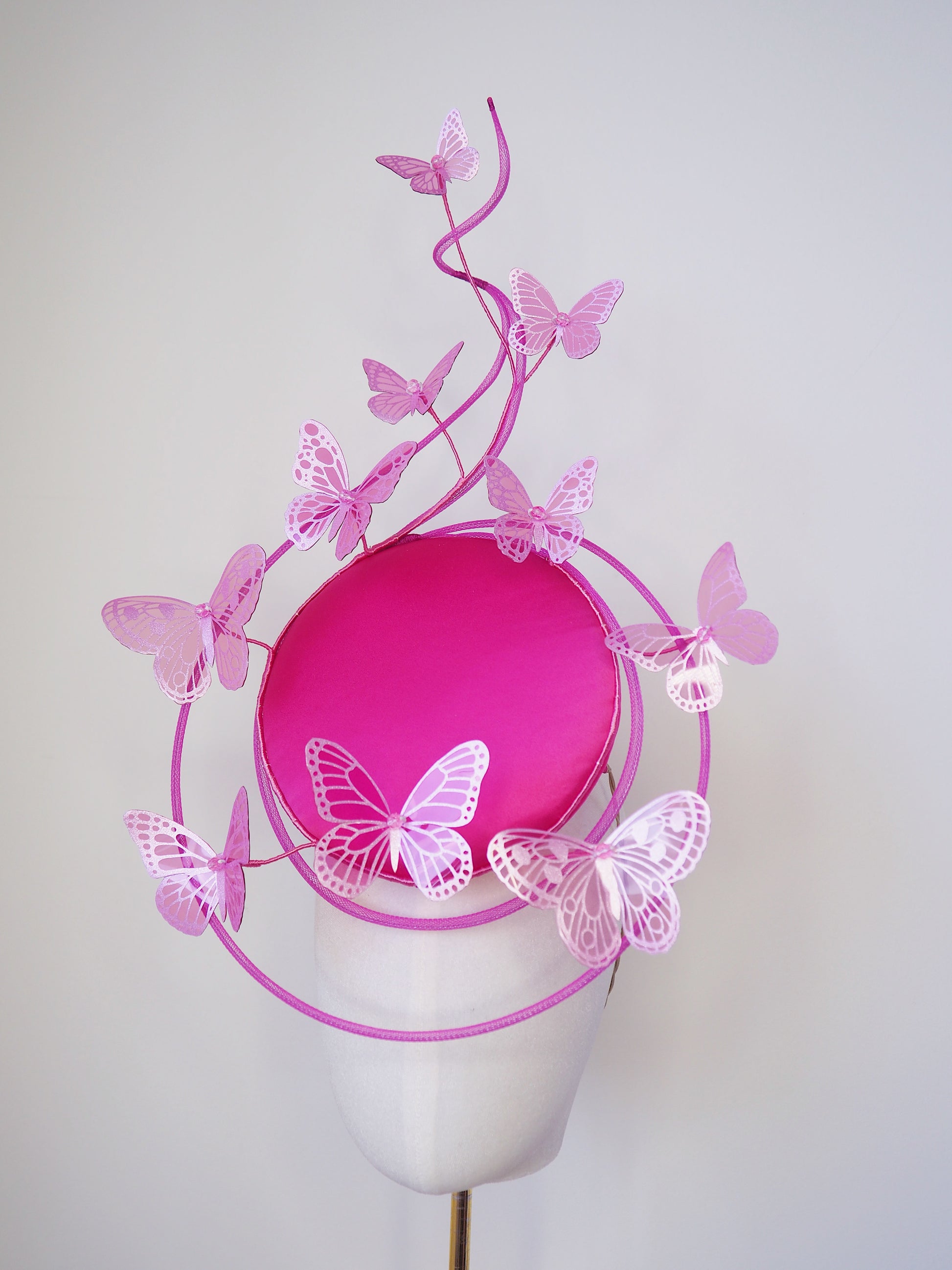 A vibrant hot pink percher with a sweeping crinoline swirl, soft lines and a sparkling cascade of butterflies. Light, playful and full of movement — a statement for spring racing.
