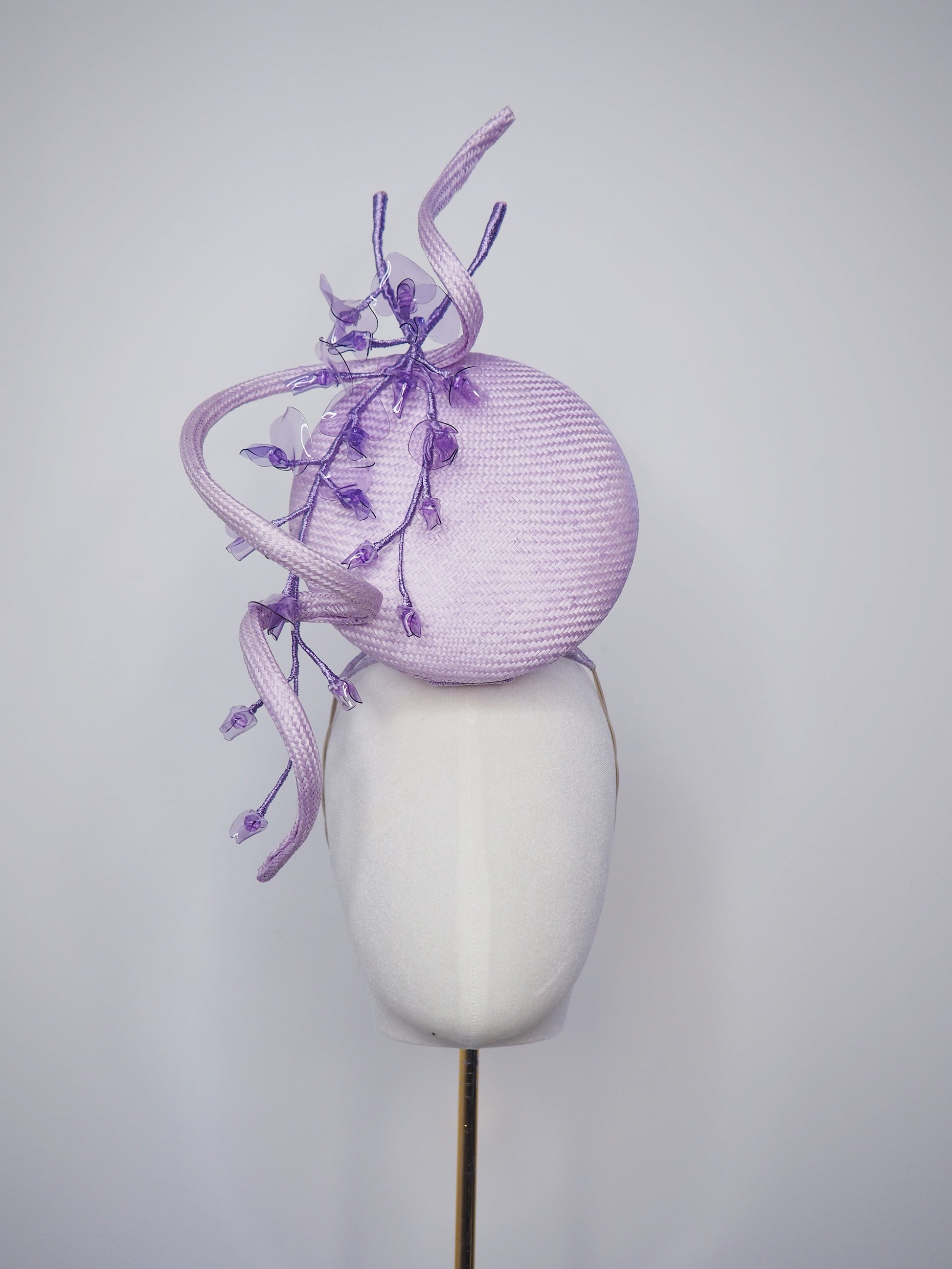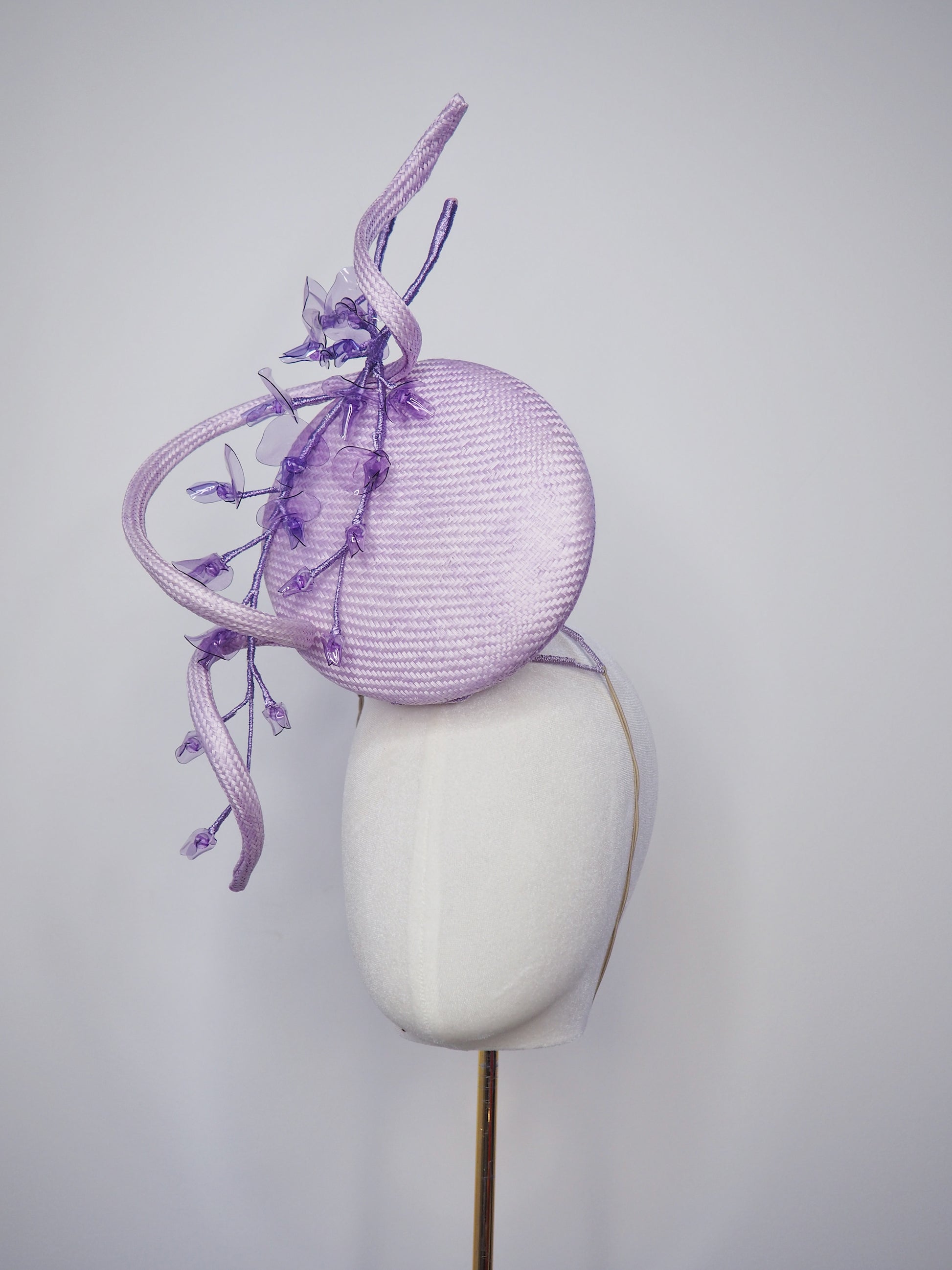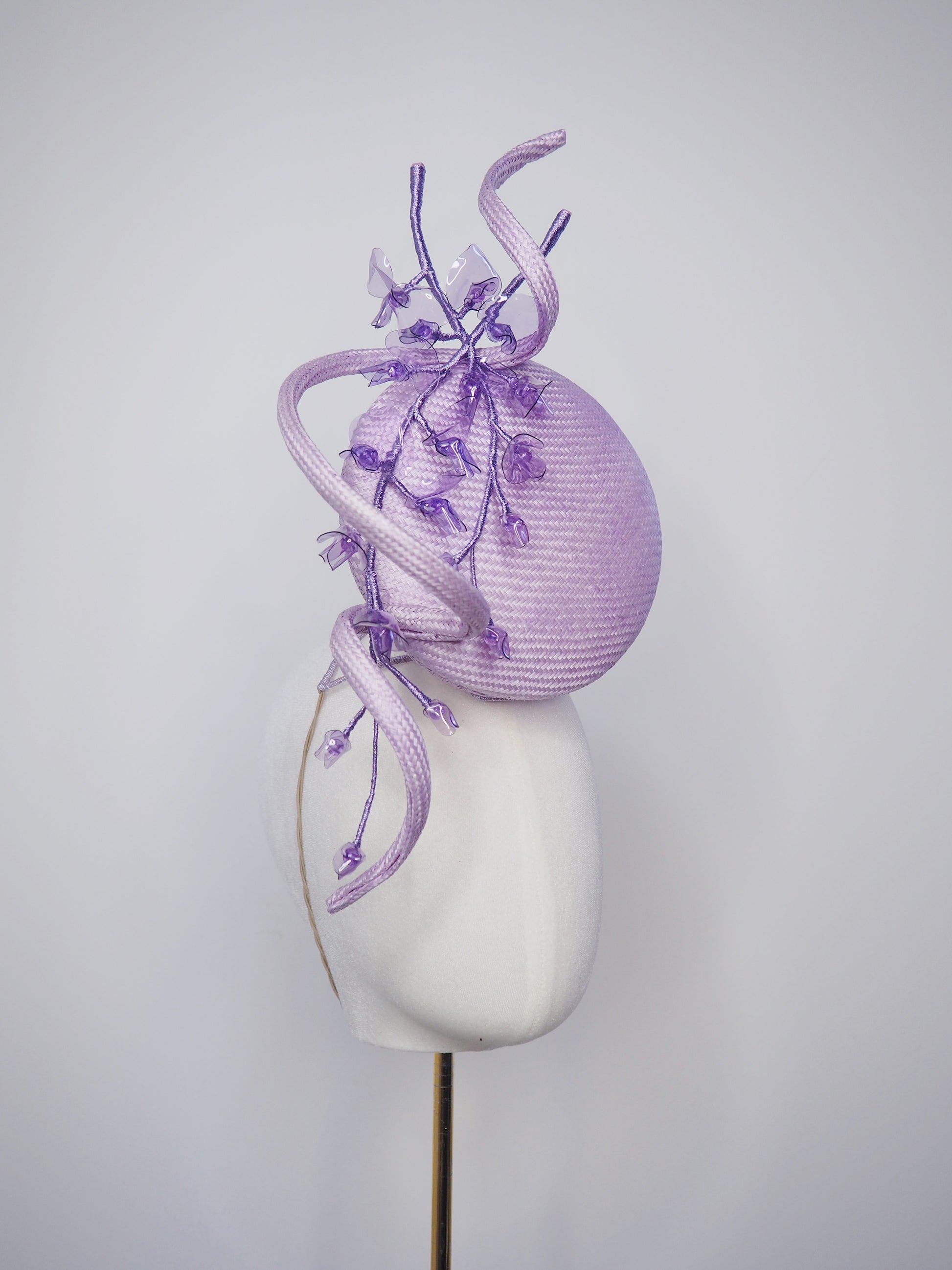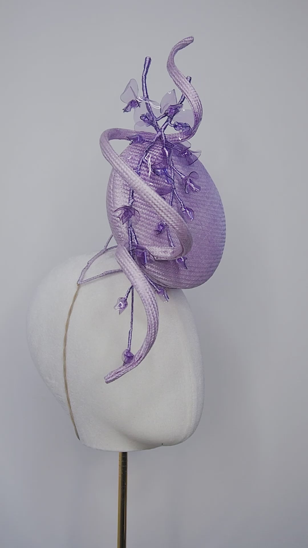 A romantic lilac parasisal percher, brought to life with a sculpted swirl and delicate creeping wisteria vines in shimmering cristoform. A soft, feminine piece with graceful movement, perfect for spring occasions.